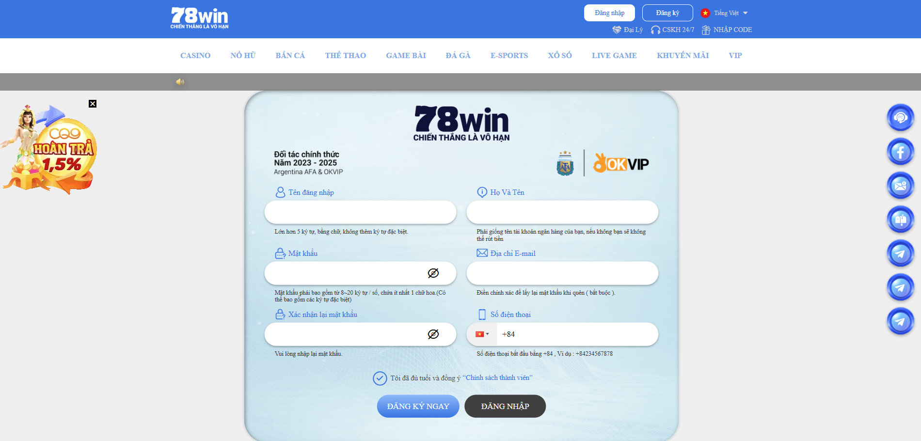 Đăng ký tài khoản tại 78WIN01 cực kỳ dễ dàng với mọi điện thoại di động smartphone, máy tính hệ điều hành khác nhau như Android APK iOS PC nhanh chóng chỉ trong 2 phút và hoàn toàn bảo mật mọi thông tin tài khoản hội viên.